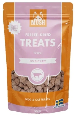 Belønn hunden eller katten din med noe skikkelig godt! Mush Frysetørket Godbit Svin består av frysetørkede biter laget av 100 % svinekjøtt – helt uten tilsetningsstoffer, konserveringsmidler eller korn.