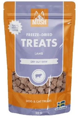 Mush Frysetørket Godbit med Lam – 100 % rent kjøtt uten tilsetninger, næringsrikt og perfekt som belønning for både hund og katt.