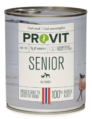 Senior er et livsfaseprodukt fra Provit som er tilpasset alder og inneholder alt hunden din trenger for et sunt og godt liv. Anbefales til hunder fra 7 år og oppover. Provit Senior er kornfritt og passer også godt til sensitive hunder.